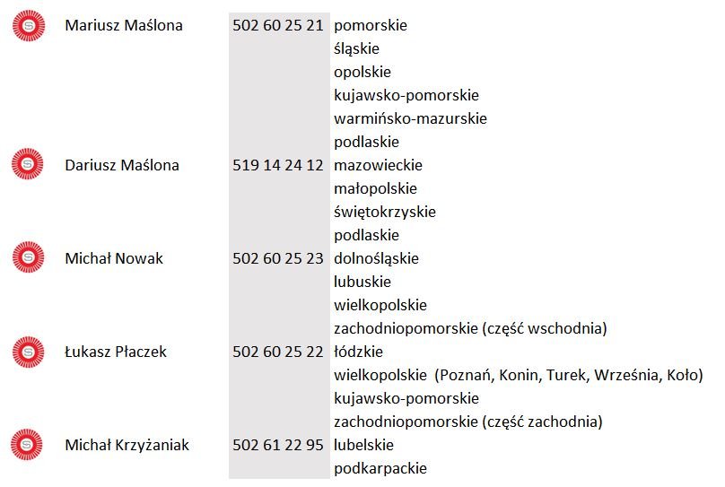 Poszczególne tereny naszego kraju, obsługują nasi bezpośredni przedstawiciele handlowi. Wyposażeni są w samochody ciężarowe z częściowym asortymentem naszych towarów standardowych. Służą oni pomocą przy wyborze odpowiednich technik szczotkowania oraz dostarczają wybrane produkty bezpośrednio do zainteresowanych. Dostępni są dla Państwa od poniedziałku do piątku w godzinach od 8:00 do 17:00